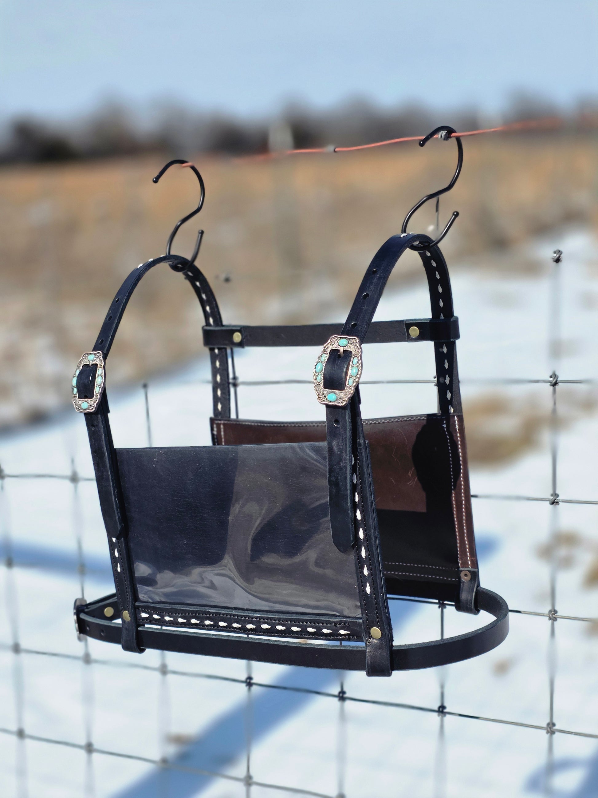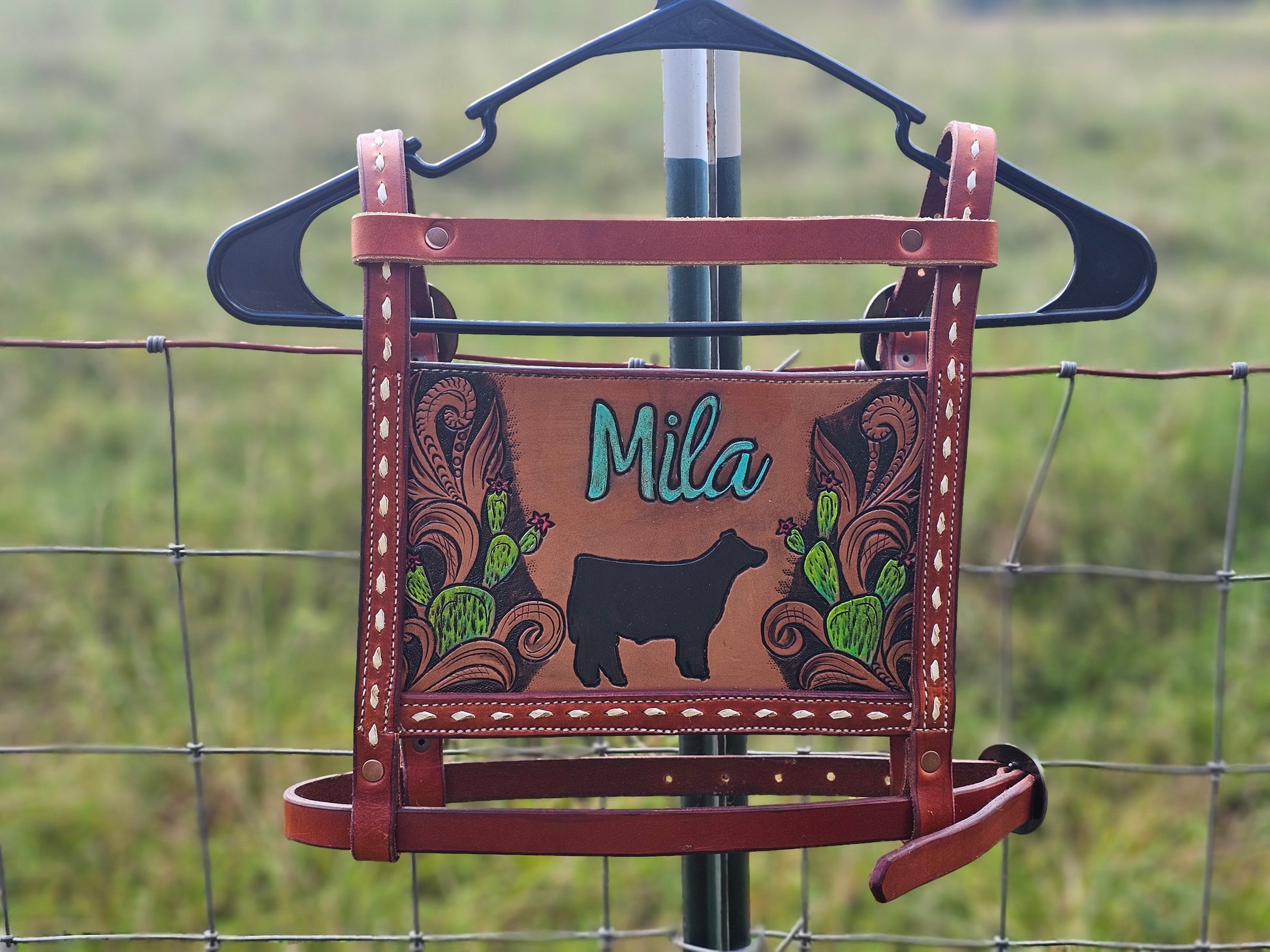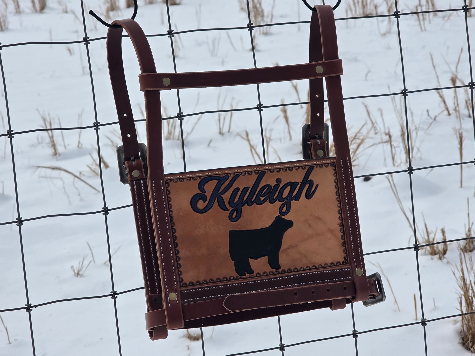 Our Custom Exhibitor Livestock Show Harness is designed to provide a comfortable, secure, and professional way to display exhibitor numbers in the show ring. Handcrafted from high-quality full grain leather, each harness is custom made to order for the exhibitor it’s intended for, ensuring proper fit, durability, and all-day comfort.